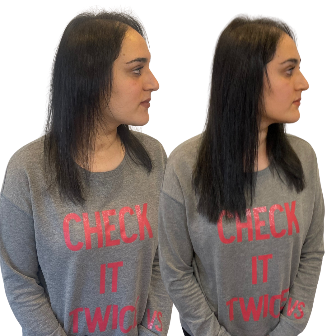 this application was specifically designed for this guest's hair after chemo! We were able to restore a lot of length and match her density with extensions as her hair continues to grow out. We love how natural this application looks and feels!